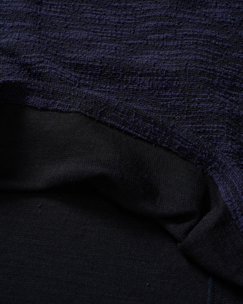 生地の特性を活かし、脇接ぎをカットオフとすること粗野な雰囲気を演出。