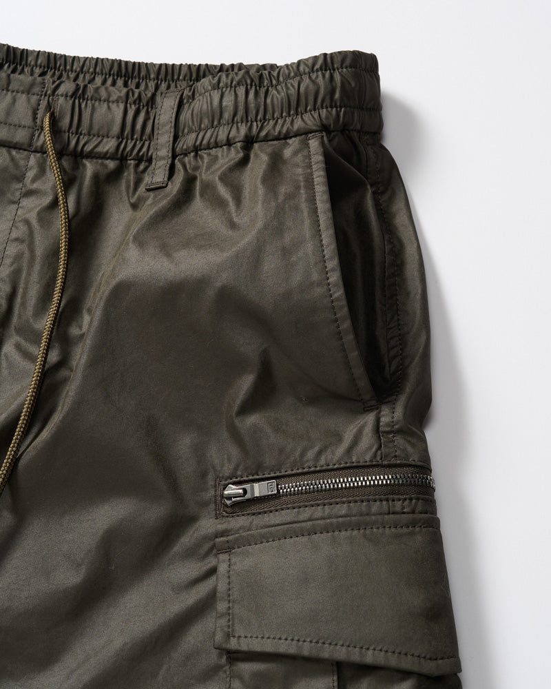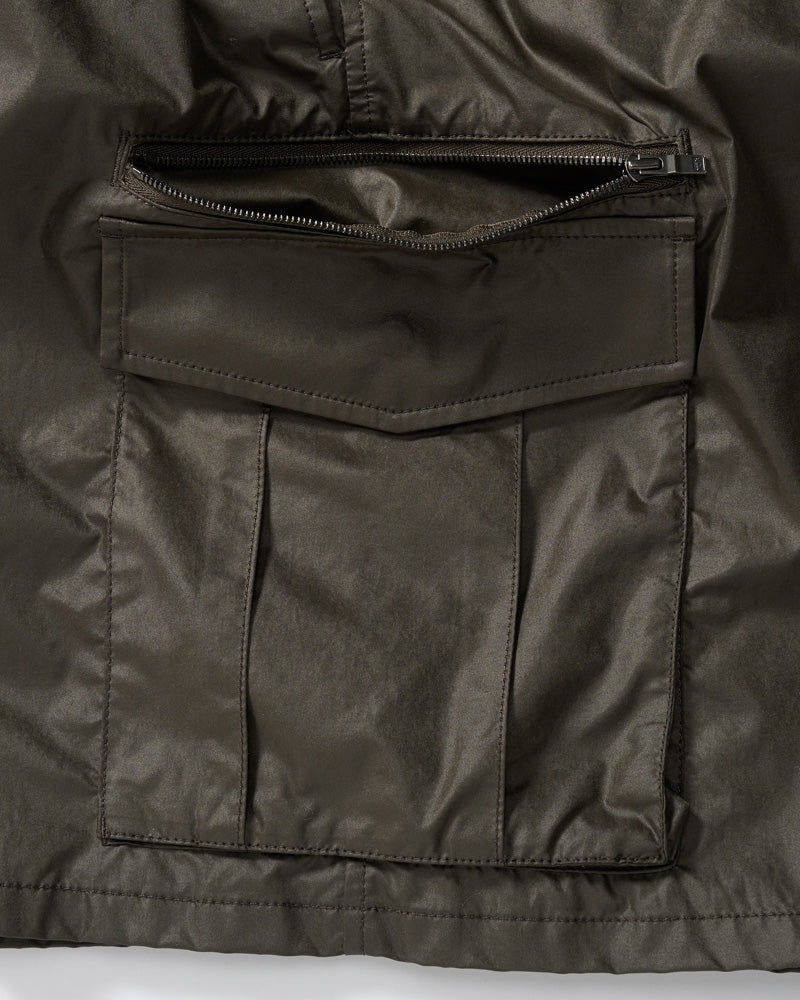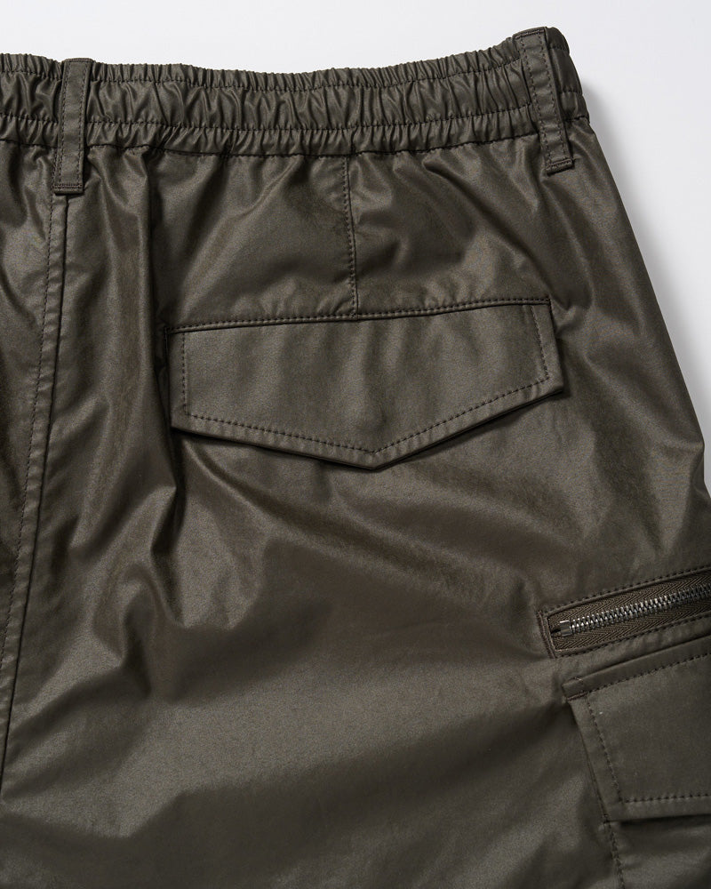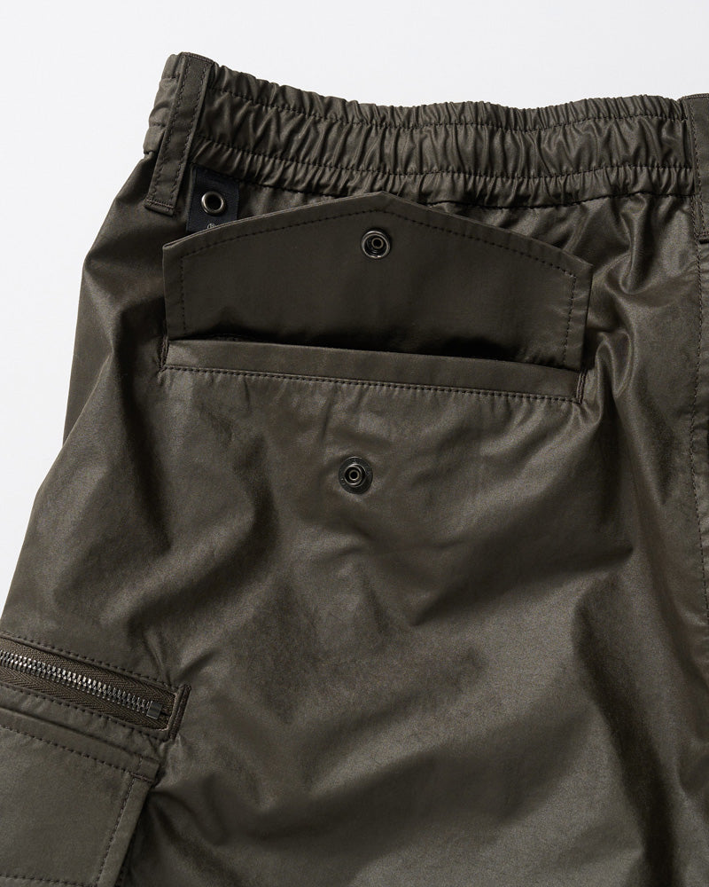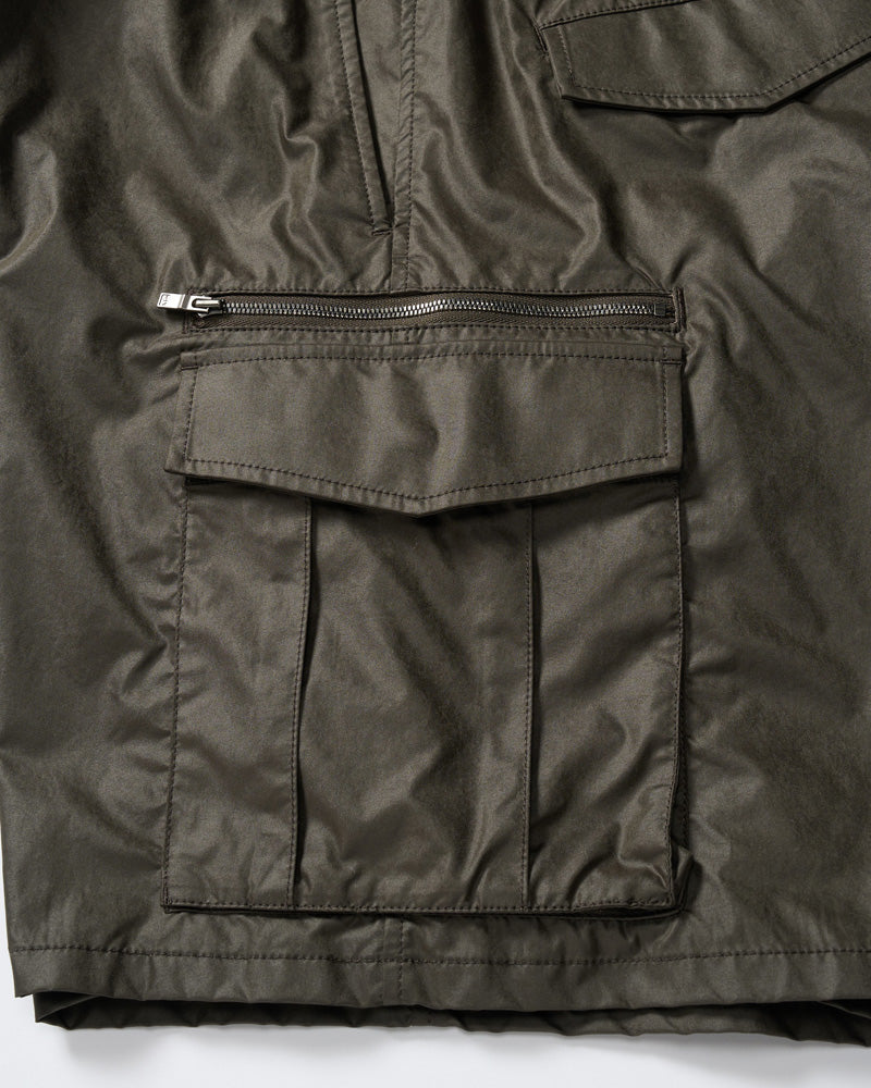 カーゴポケット上にファスナーを走らせ、デザインアクセントとすると共に機能性を高めている。カーゴポケットはマチを設けることで程よいボリュームを出すことができる。