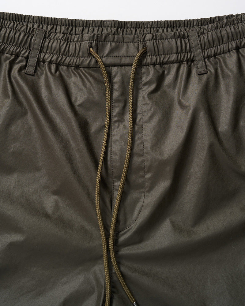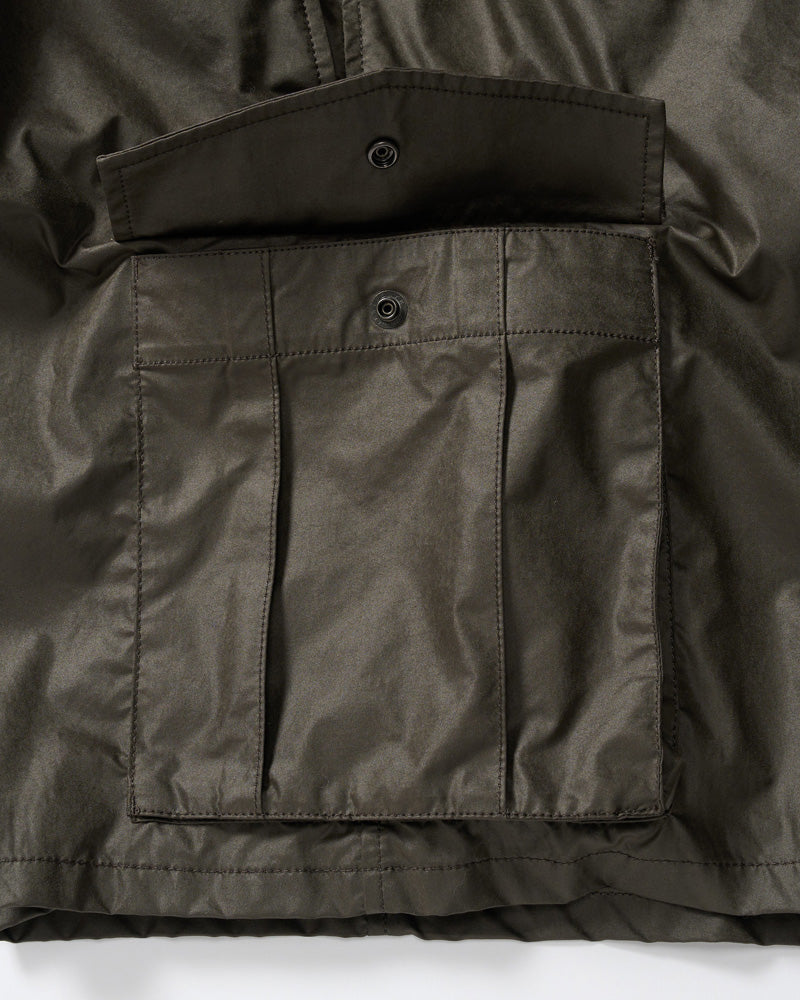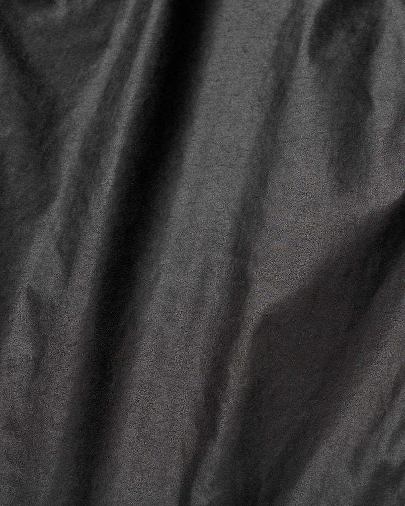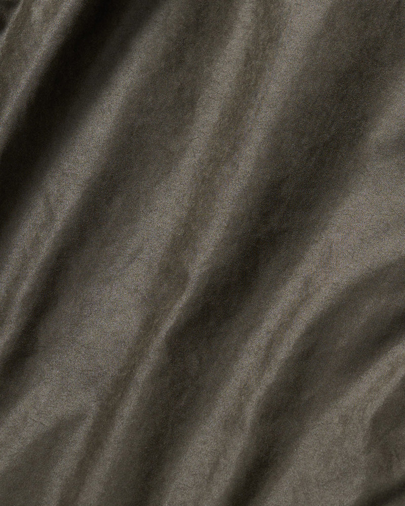 高密度で織り込んだツイル素材にBJ加工を施すことで、形状保持性と耐久撥水性に加え、独特のハリコシを生み出した高機能素材を採用。更に光沢加工を施し、ヴィンテージ調の見え方を演出している。