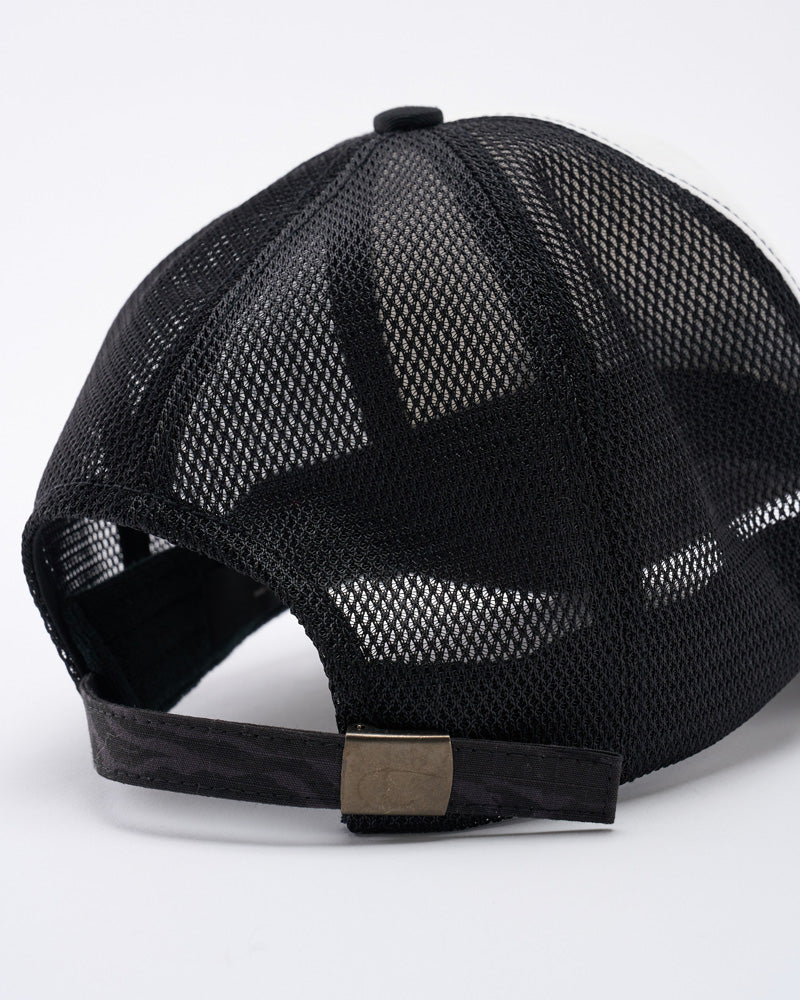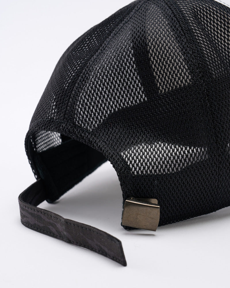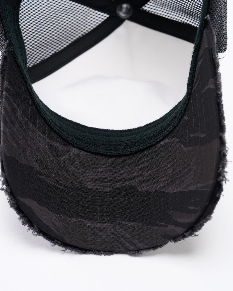 つば裏、後部アジャスターベルトには、タイガー迷彩がプリントされたリップストップ生地を使用し、アクセントとしている。