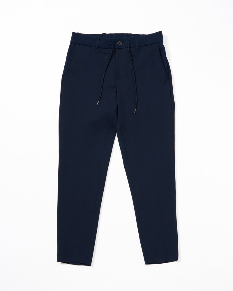 ラインの綺麗なテーパードシルエットを持つ定番イージースラックス。太腿から裾にかけテーパードを強めることで綺麗な立体感に仕上げている。ベルトループとスピンドル(腰ひも)の両構造でオンにもオフにも対応可能。