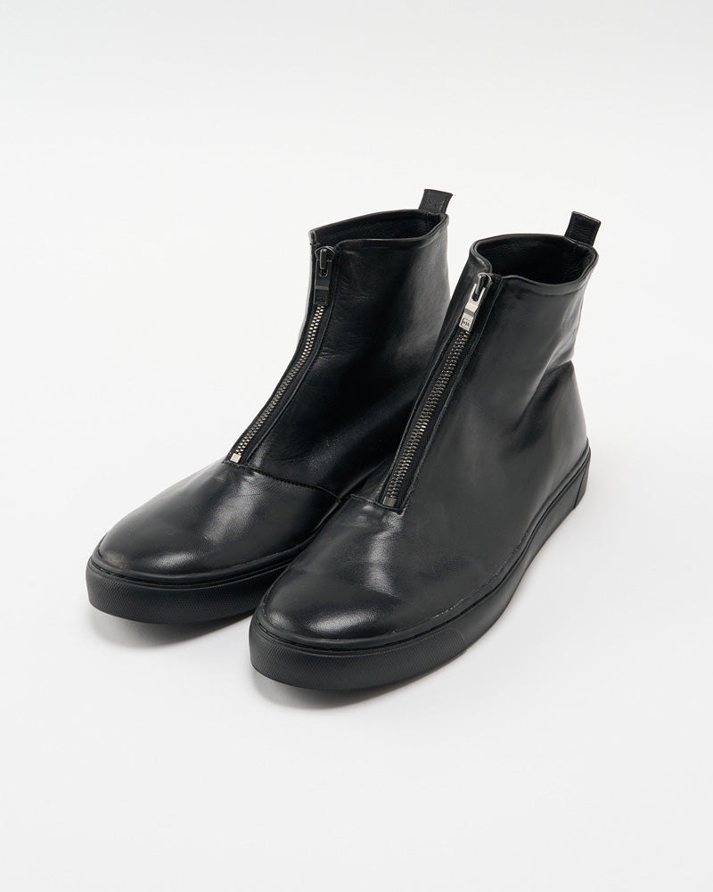 フロントファスナーで着脱が容易なジップスニーカー。オーセンティックなアッパーデザインながら、シュータンを排除し履き口のボリュームを抑えることでブーツの様なたたずまいに仕上げている。